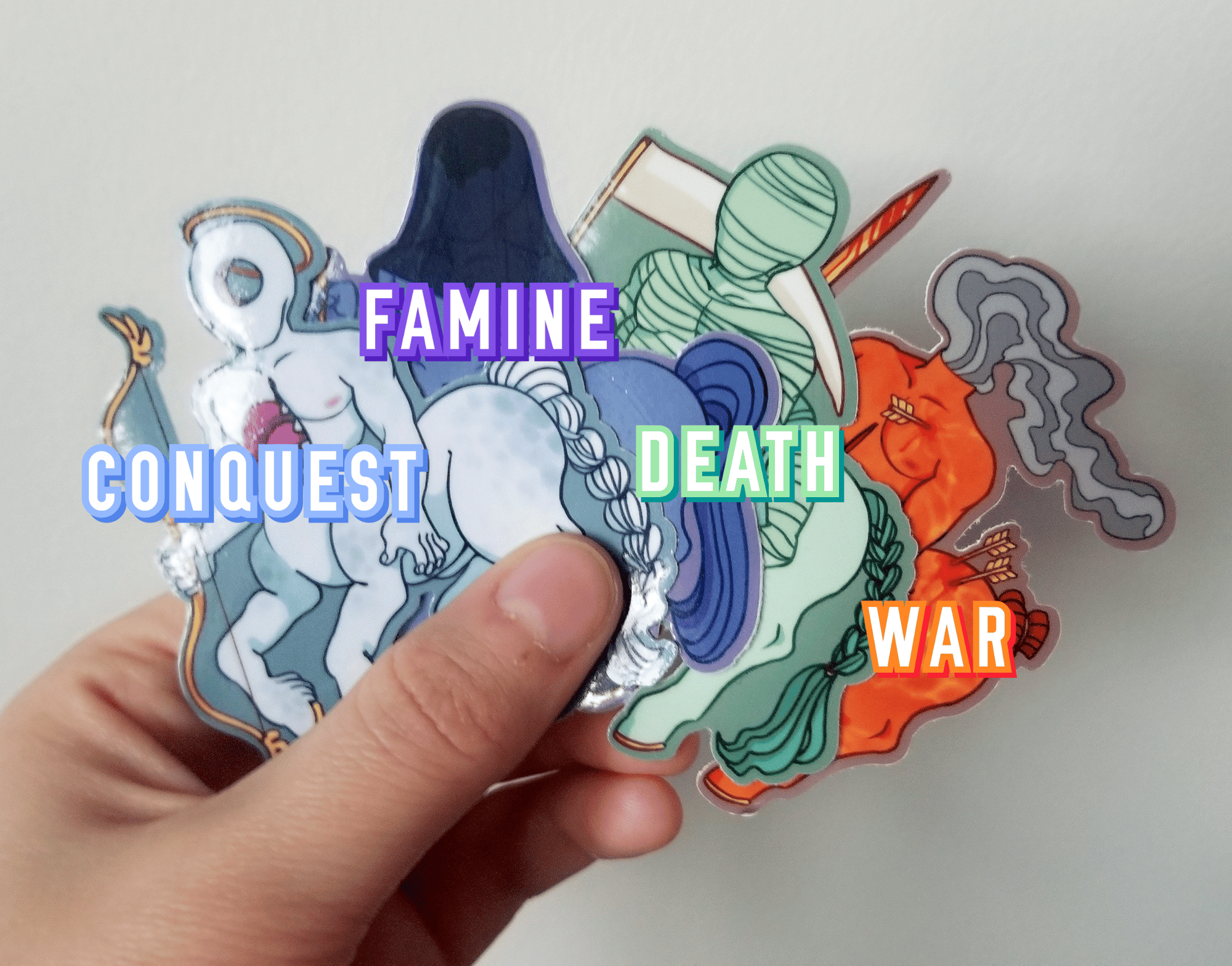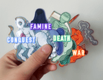 Vinyl stickers featuring my renditions of the four horsemen of the apocalypse! Choose from Conquest, War, Famine, or Death, or buy them as a set.