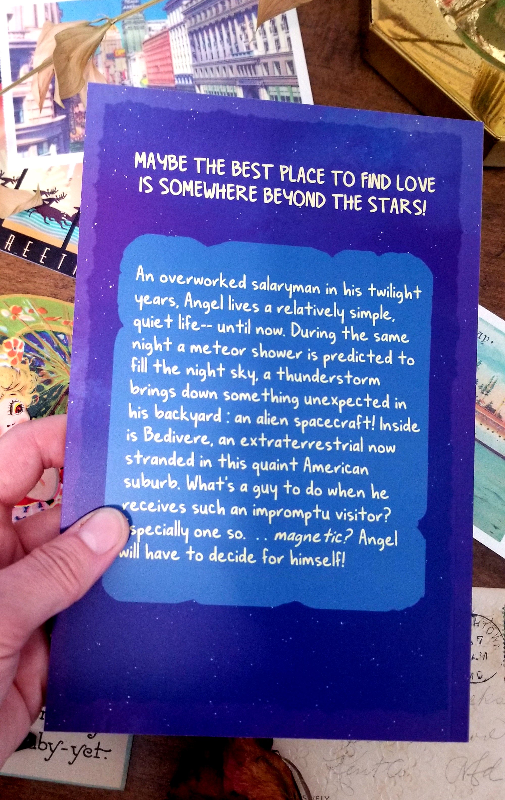 My Husband Is a Space Alien follows Ángel, an overworked salaryman living a quiet life in suburbia. When a storm and meteor shower bring down something unexpected in his backyard, he ends up with an unusual predicament: first contact! The alien he encounters doesn't seem all that scary though, once they get to know each other... and perhaps Ángel is sort of... smitten?
