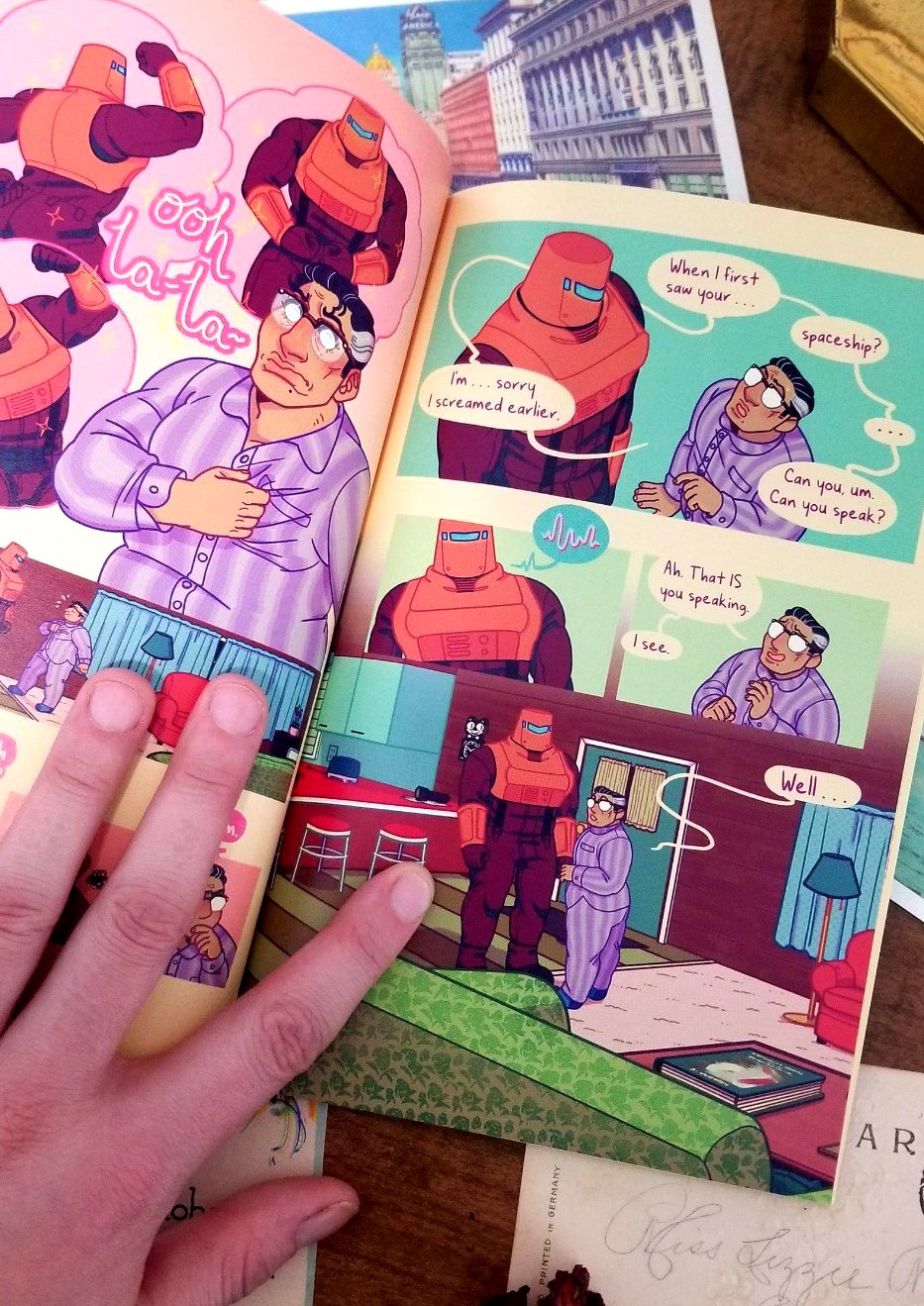This is a love story to the aesthetics of retrofuturism and 1950s suburbia! Think "I Love Lucy", but add an extraterrestrial and make it queer.